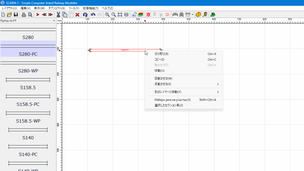 レールを右クリックするとメニューが表示され、「回転」や「移動」などの操作ができます。レイアウト設計でよく使う操作は、基本的にこの右クリックメニューから行えます。特別な操作を覚えなくても、直感的にレイアウトを作ることができます。