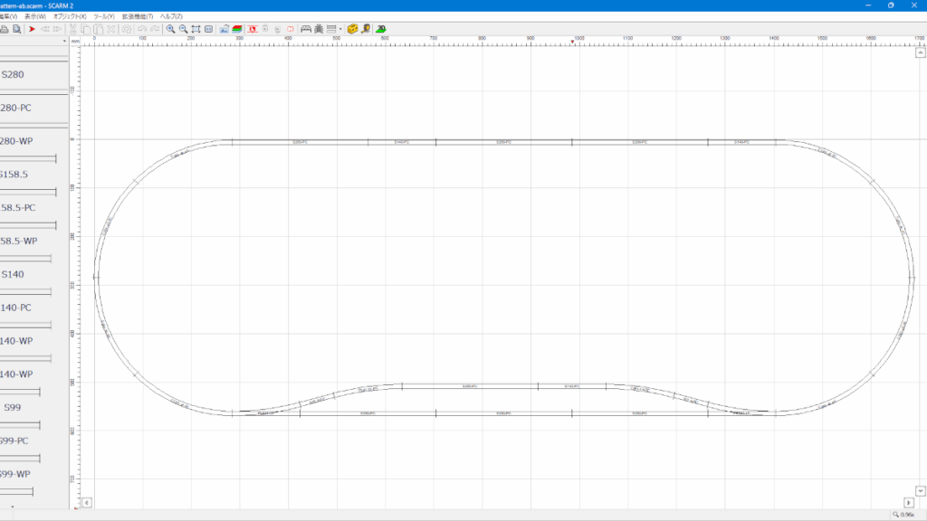 今回は実例として、トミックス公式サイトに掲載されているレイアウトプラン(レールパターンA+B)をSCARMで模写してみました。実際のレール配置をそのまま再現しているので、SCARMの操作に慣れる練習用としてもおすすめです。