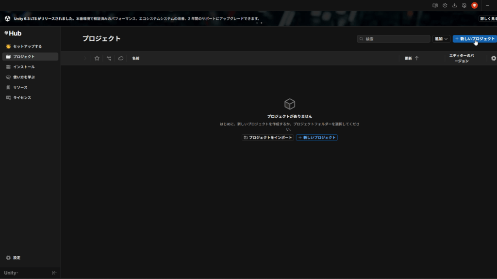 Unity Hub 左側の「プロジェクト」をクリックし、画面右上の「新しいプロジェクト」をクリックします。
