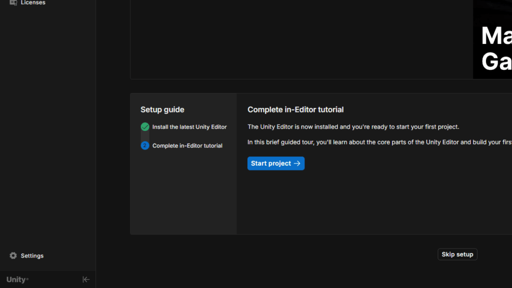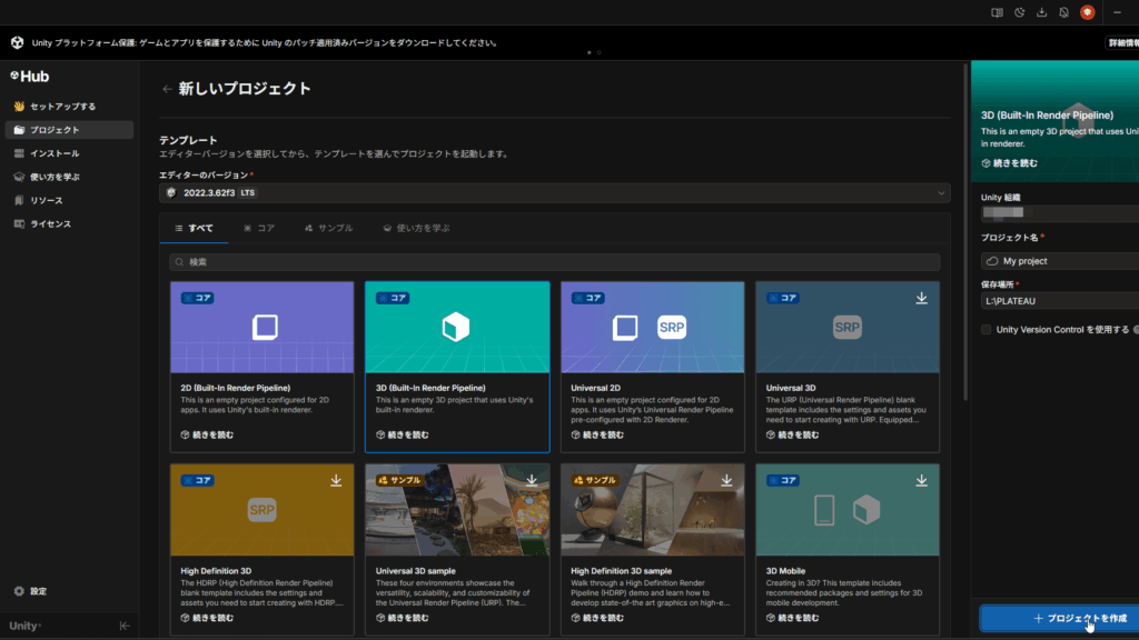 1. エディターのバージョンで、プルダウンから「2022.3.**** LTS」を選択します