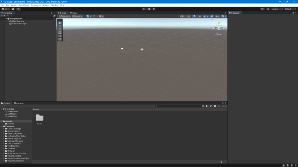 Unity の画面が開いたら、プロジェクトの作成は完了です。