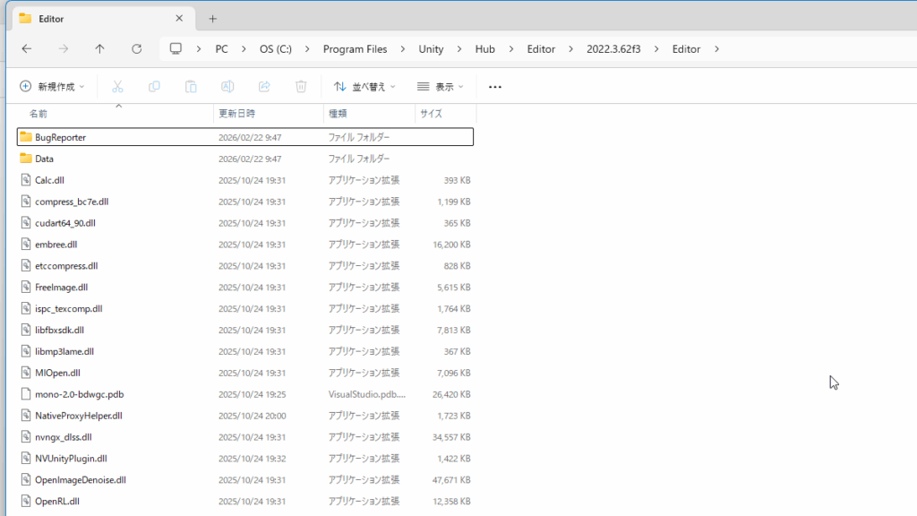 エクスプローラーを開き、「Unity 2022.3 LTS」がインストールされているフォルダへ移動します。