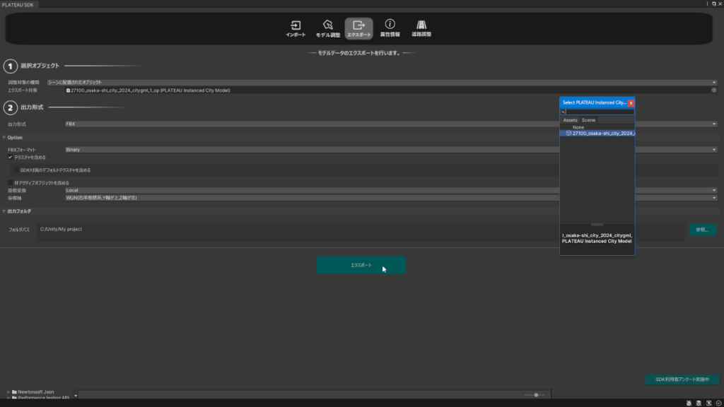 「エクスポート対象」の右端にある小さなアイコンをクリックすると、選択ダイアログが表示されます。現在「Unity」の画面に表示している「osaka_shi_city_…」を選択します。