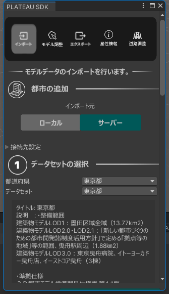 3D都市モデルをエクスポートするには、「PLATEAU SDK」画面で次の4つの手順を実行します。