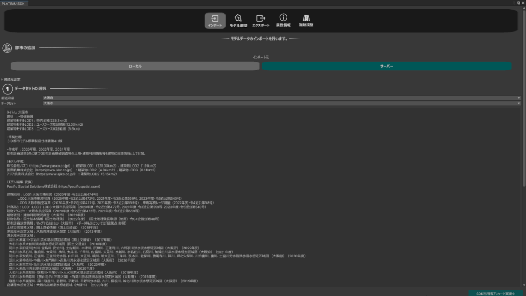 「都市の追加」のインポート元で「サーバー」を選択します。データの読み込みが開始され、しばらく待つとデータセットの選択画面と都市名の一覧が表示されます。今回は例として、「大阪府」の「大阪市」を選択します。