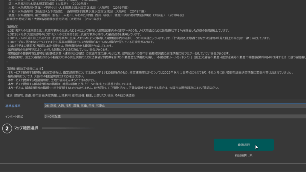 最後に、画面端に移動しておいた「PLATEAU SDK」のウィンドウを中央に戻し、「範囲選択:セット済」と表示されていることを確認します。