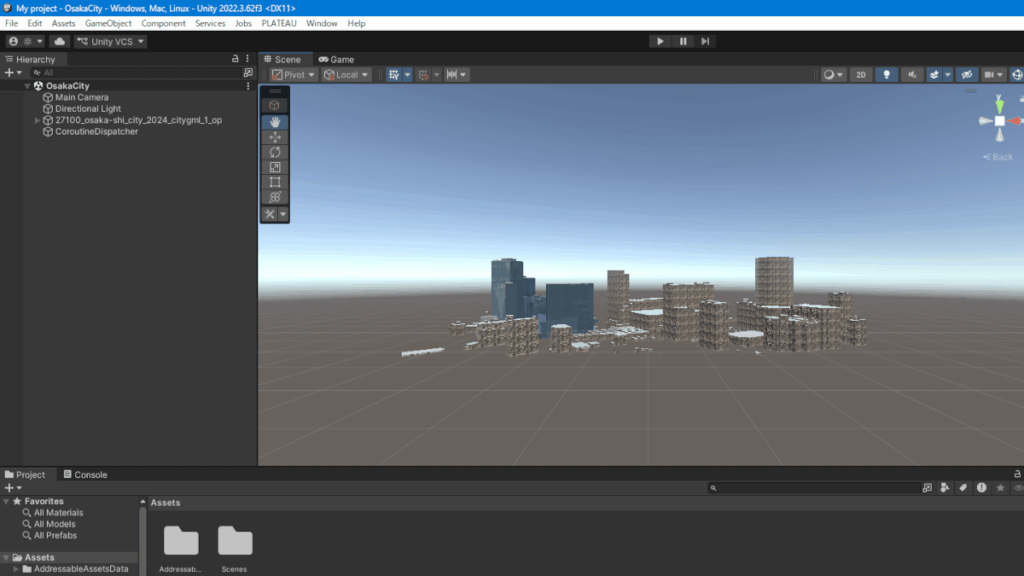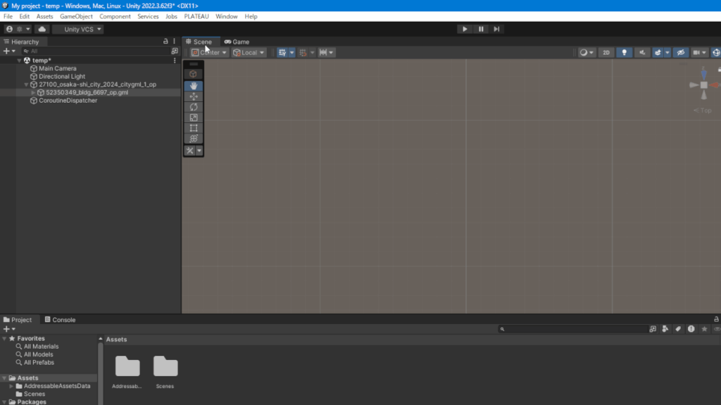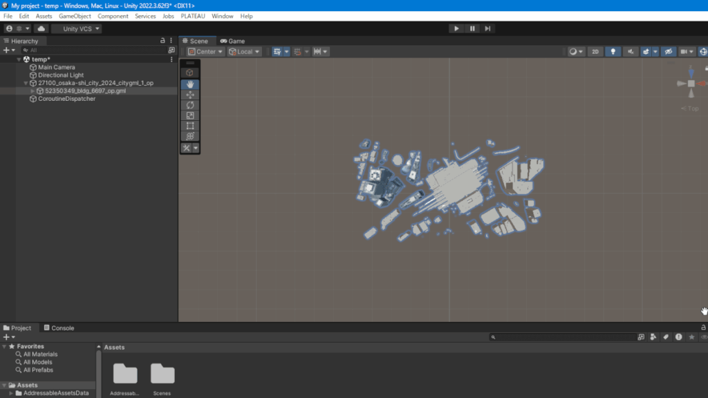 「Unity」の画面に戻ると、何も表示されていないように見える場合がありますが、これはモデルの表示位置とカメラの位置がずれているためです。画面左側の一覧(Hierarchy)から「osaka_shi_city_…」を選択し、キーボードの「F」キーを1回押してください。