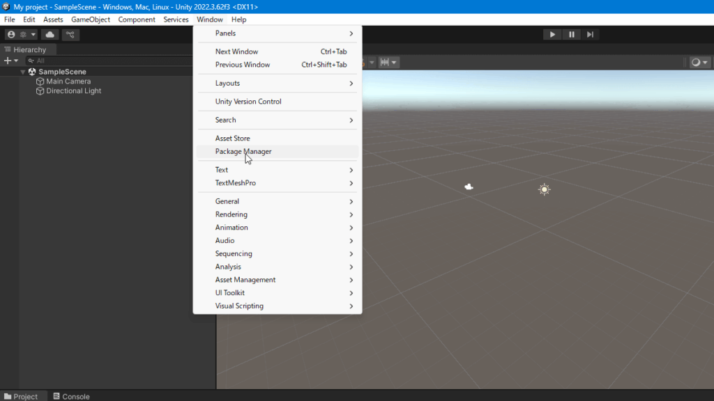 Unity 画面上部のメニューから「Window」→「Package Manager」をクリックします。