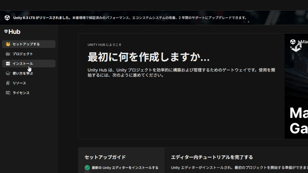 Unity Hub 左側メニューの「インストール」をクリックします。