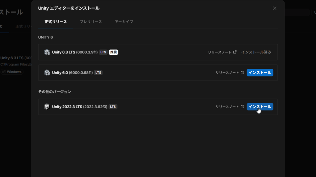 一覧から「Unity 2022.3 LTS」の「インストール」をクリックします。