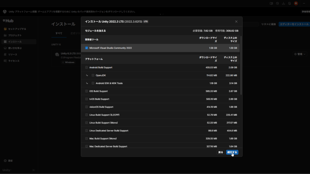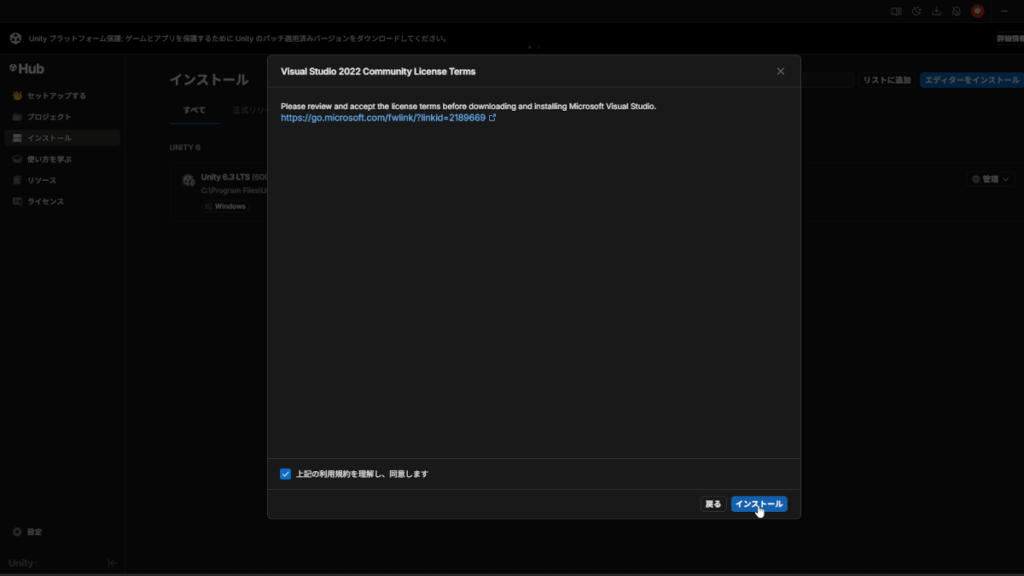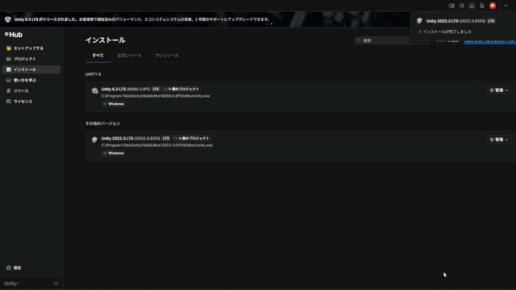 画面右上に「インストールが完了しました」と表示され、「その他のバージョン」に「Unity 2022.3 LTS」が表示されれば完了です。