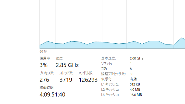 画面に表示されている「コア」の数がCPUのコア数です。※この画像の例では 8コアです。